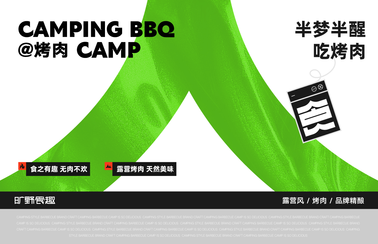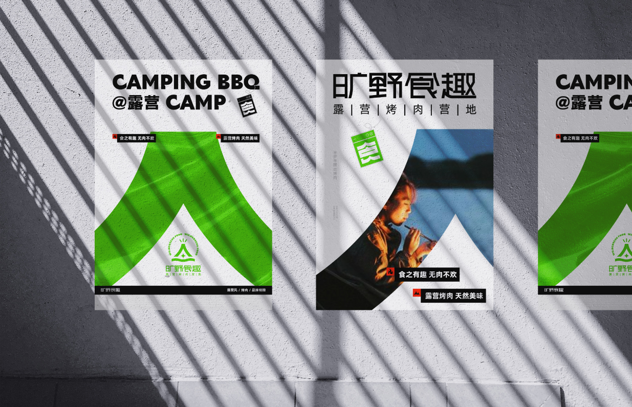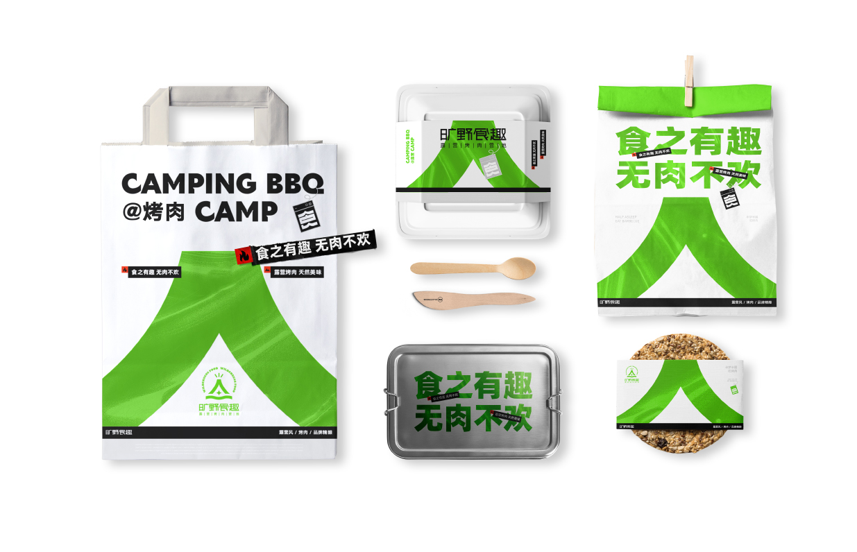 Introduction:“曠野食趣”寓意著在廣闊的野外享受美食的樂趣。體現(xiàn)了品牌的露營風格,也表達了為消費者提供的輕松愉快的餐飲體驗。品牌整體風格以輕松明快的嫩綠色為主,搭配黑色,醒目且富有現(xiàn)代感。這種顏色搭配既符合露營的自然氣息,又具有現(xiàn)代感,能夠吸引年輕消費者的關注。品牌logo以“人”字結合帳篷形狀,體現(xiàn)了品牌的露營特色。這個設計簡潔明了,易于識別和記憶,同時也體現(xiàn)了品牌注重戶外體驗的特點。