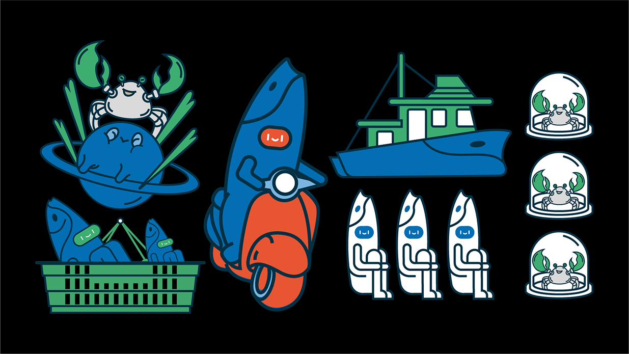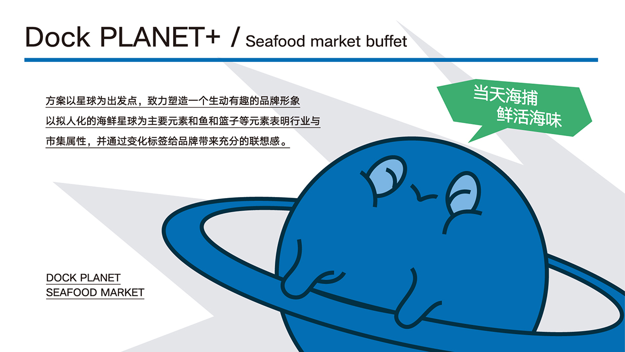 方案以星球?yàn)槌霭l(fā)點(diǎn),致力塑造一個(gè)生動(dòng)有趣的品牌形象以擬人化的海鮮星球?yàn)橹饕睾汪~(yú)和籃子等元素表明行業(yè)與市集屬性,并通過(guò)變化標(biāo)簽給品牌帶來(lái)充分的聯(lián)想感。